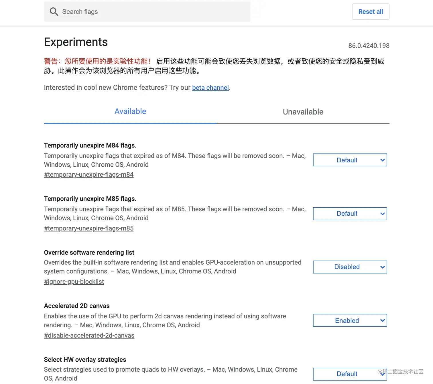 Chrome 浏览器地址栏上输入 chrome://flags/ 。