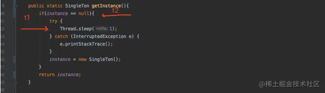 注:这里通过休眠一毫秒来模拟线程挂起,为初始化完instance