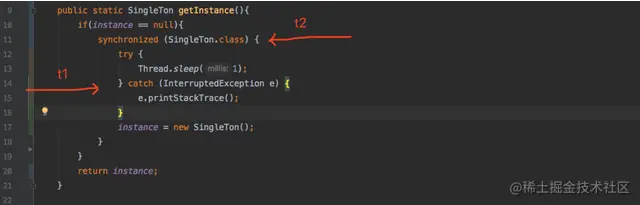当并发访问的时候,第一个调用getInstance方法的线程t1,在判断完singleton是null的时候,线程A就进入了if块准备创造实例,但是同时另外一个线程B在线程A还未创造出实例之前,就又进行了singleton是否为null的判断,这时singleton依然为null,所以线程B也会进入if块去创造实例,这时问题就出来了,有两个线程都进入了if块去创造实例,结果就造成单例模式并非单例。