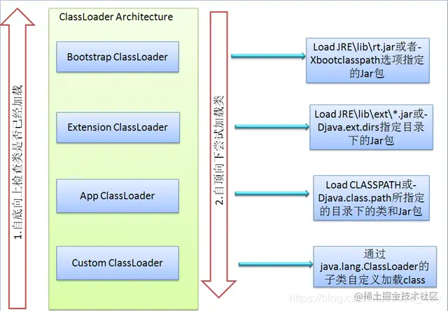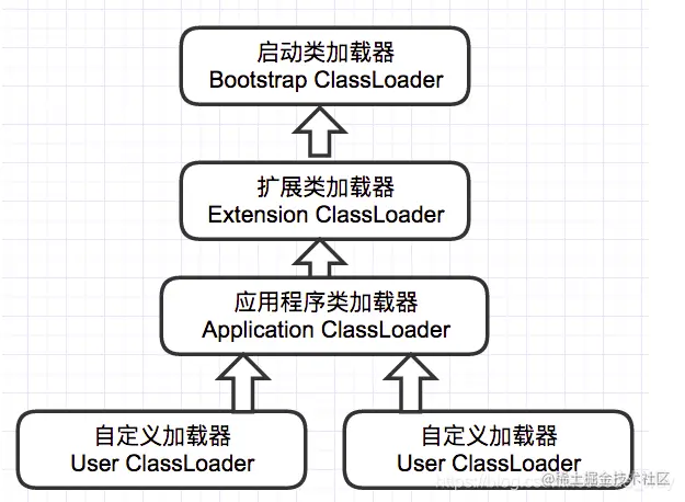 JVM的类加载是通过多层次的类加载器来完成的,类的层次关系和加载顺序可以由下图来描述: