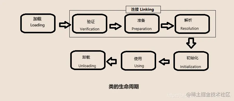 类加载过程是如下图所示的一个流水线过程,其中连接过程可细化为验证、准备和解析三个小步骤。