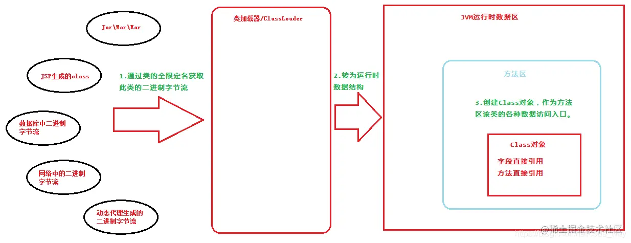 - 通过一个类的全限定名来获取定义此类的二进制字节流(class文件)。在程序运行过程中,当要访问一个类时,若发现这个类尚未被加载,并满足类初始化的条件时,就根据要被初始化的这个类的全限定名找到该类的二进制字节流,开始加载过程
