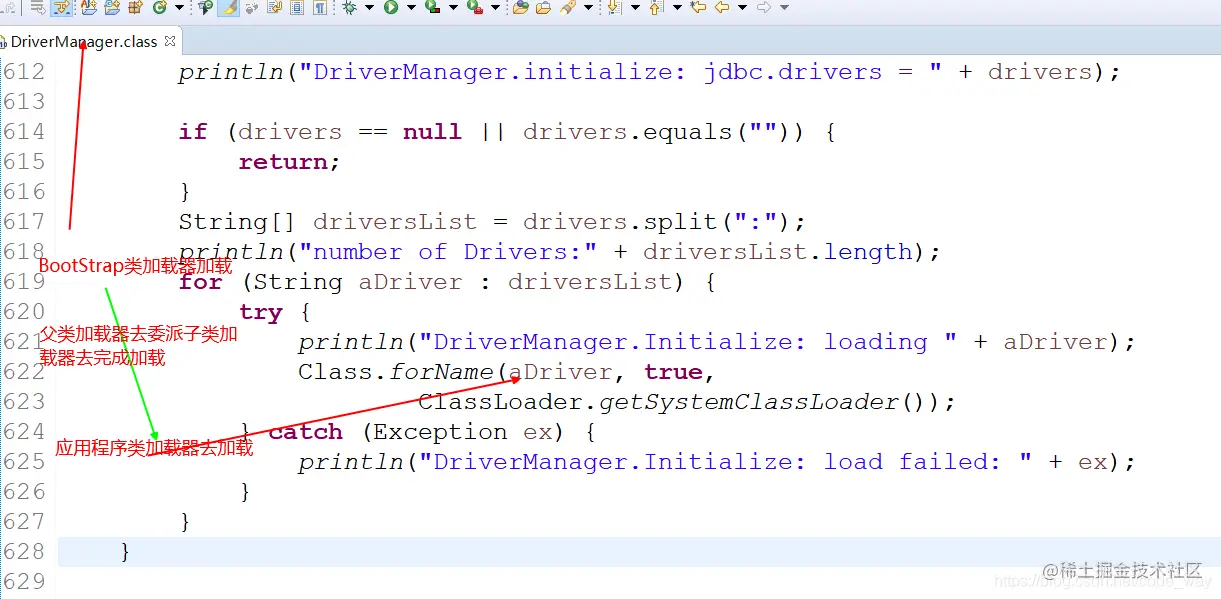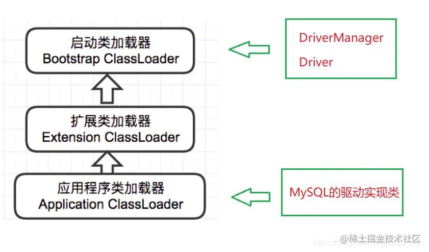 那么问题就来了,DriverManager(也由jdk提供,JDK1.2之前就写好了)要加载各个实现了Driver接口的实现类(在classpath下),然后进行管理,但是DriverManager由启动类加载器加载,只能加载JAVA_HOME\lib下的文件,而其实现是由服务商提供的,有系统类加载器加载,这个时候就需要启动类加载器来委托子类加载器来加载Driver实现,从而破坏了双亲委派。如下图所示。
