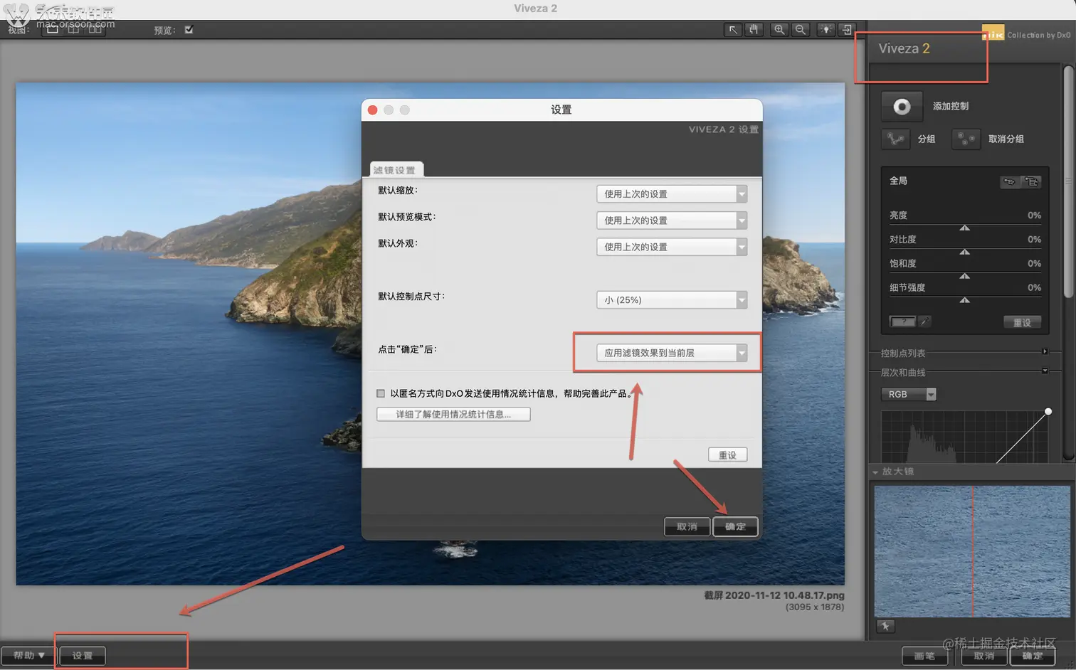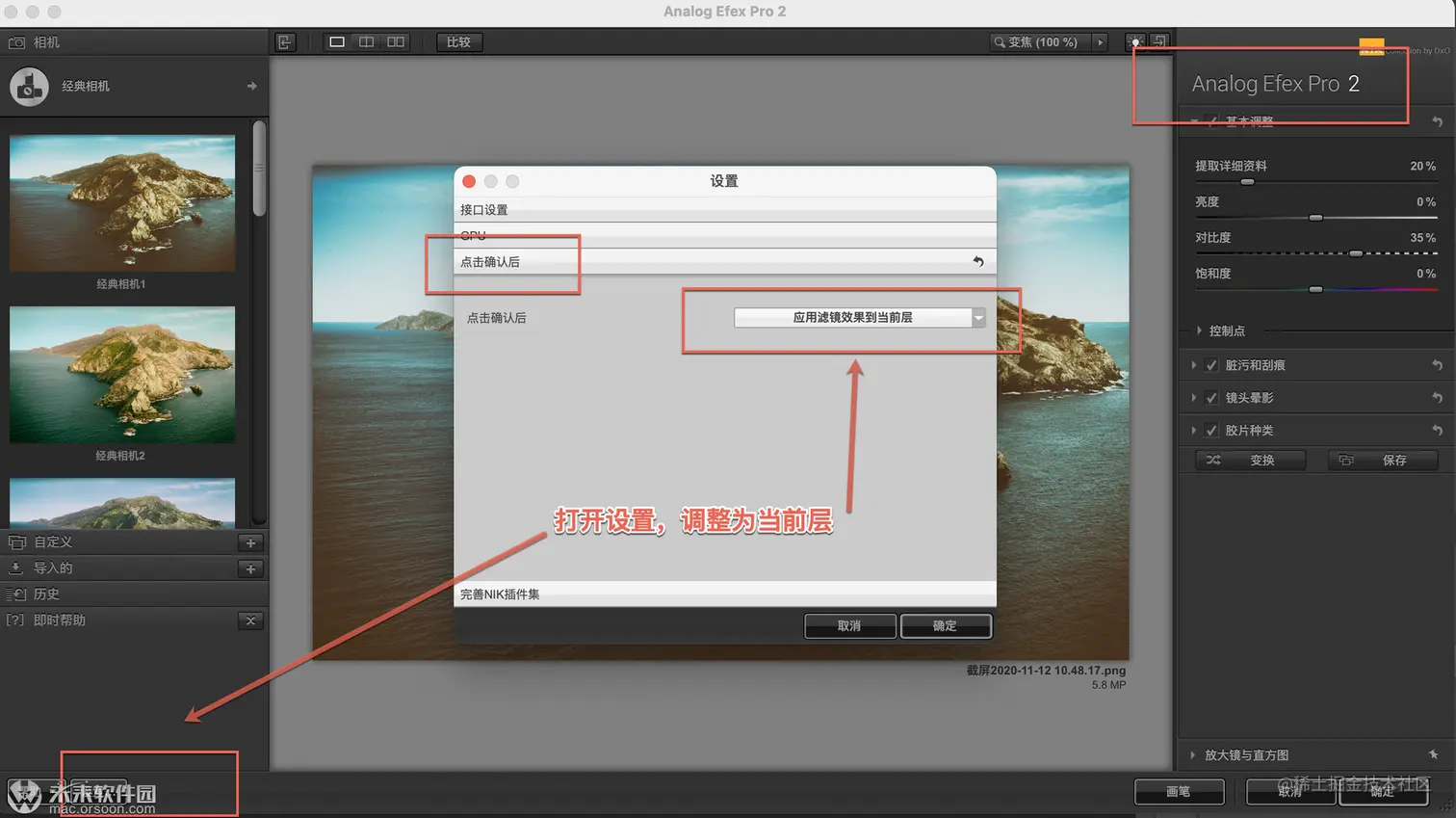 2.把图层设置为“应用滤镜效果到当前层”,点击确定即可。