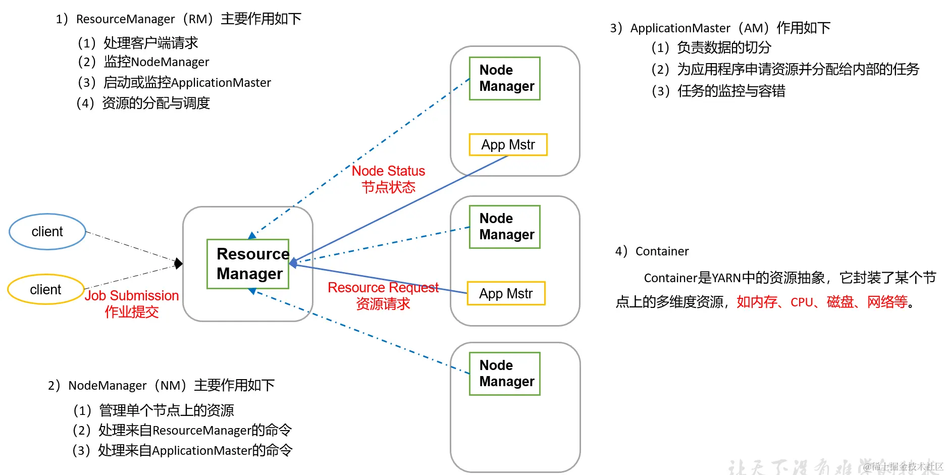 主节点(Resource Manager)进程主要负责集群资源的分配和管理,从节点(Node Manager)主要负责单节点资源管理。