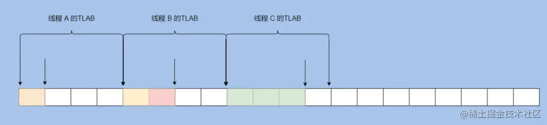 可以看到每个线程有自己的一块内存分配区域,短一点的箭头代表 TLAB 内部的分配指针。