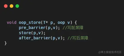 在 Hotspot 中的实现是卡表,是通过写后屏障维护的,伪代码如下。