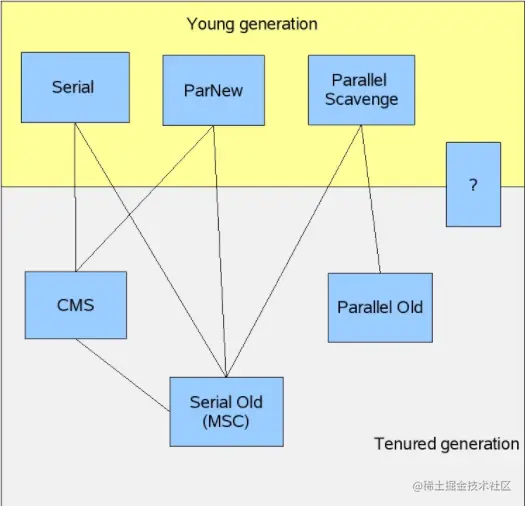 这张图是 2008 年 HostSpot 一位 GC 组成员画的,那时候 G1 还没问世,在研发中,所以画了个问号在上面。