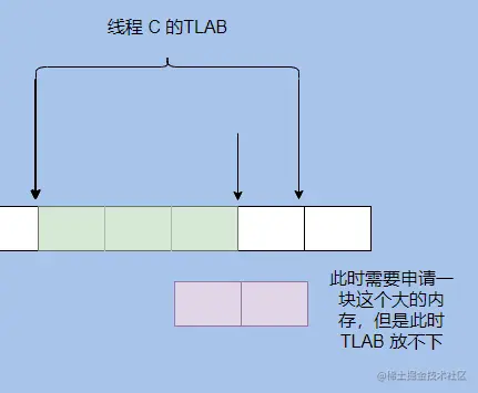 可以看到 TLAB 内部只剩一格大小,申请的对象需要两格,这时候需要再申请一块 TLAB ,之前的那一格就浪费了。
