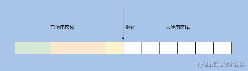 内存是紧凑的,新对象创建指针就右移对象大小 size 即可,这叫指针加法(bump [up] the pointer)。
