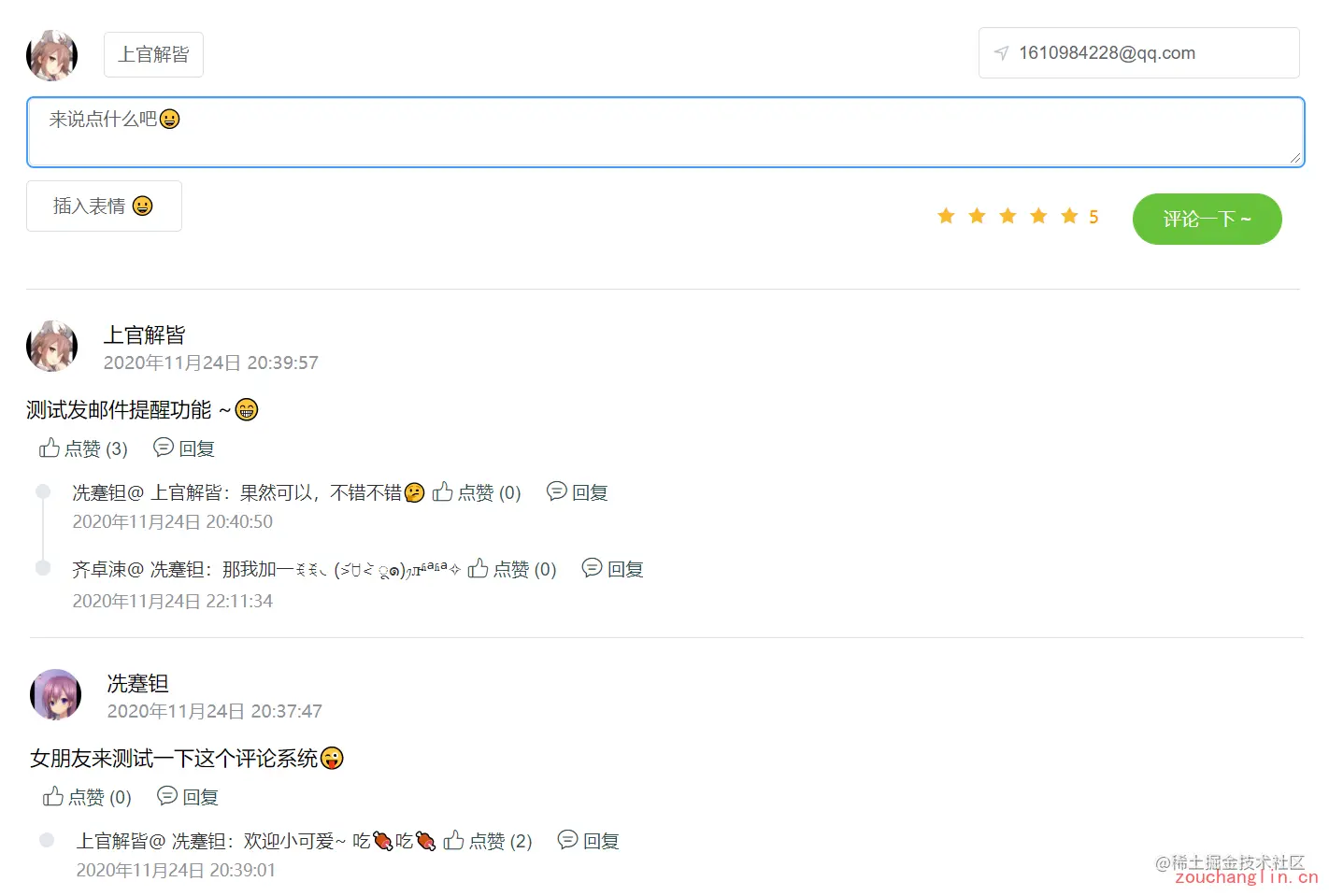 4、支持自己的评论被别人回复后可以邮件通知