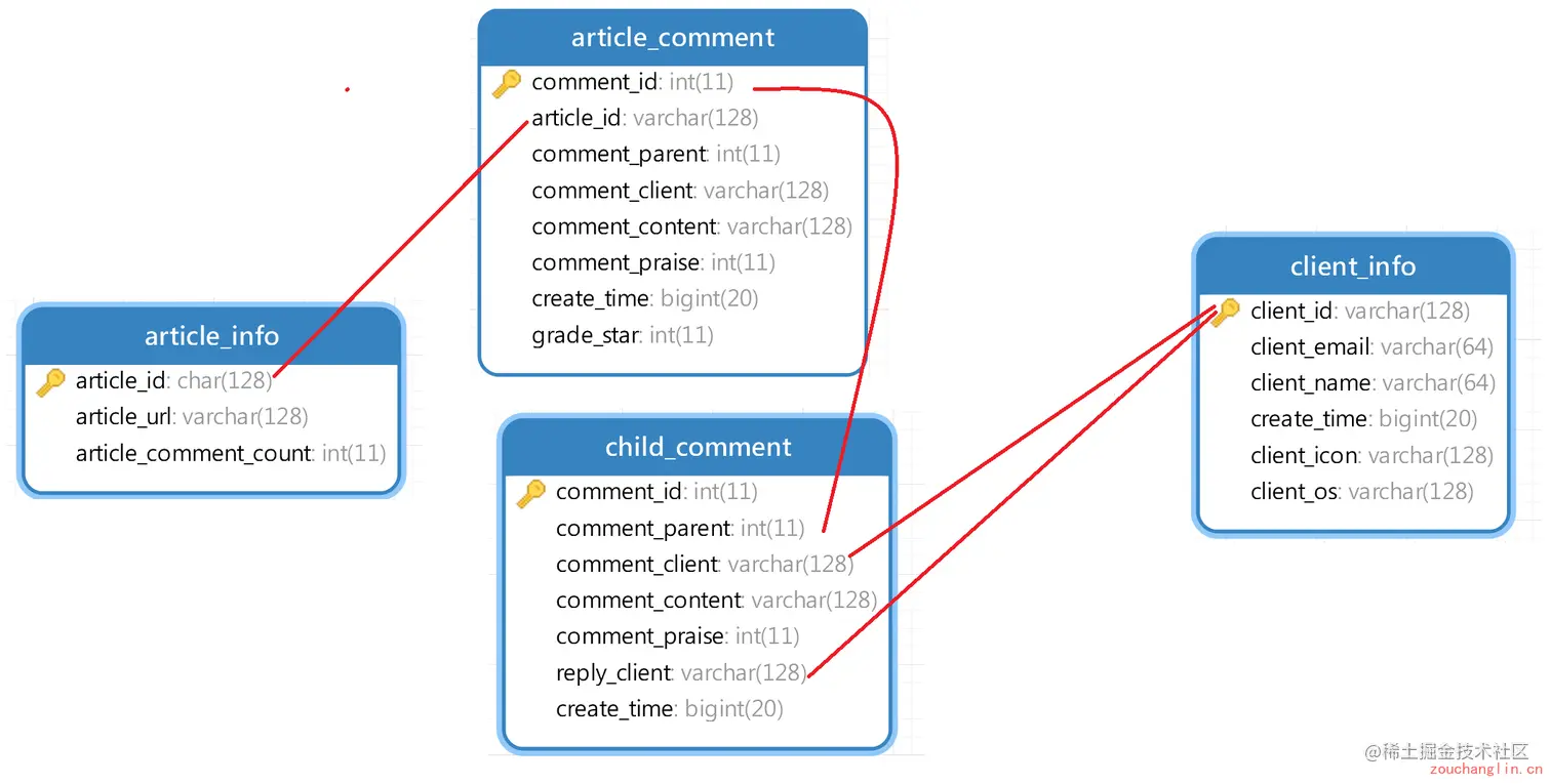 然后是评论表,在这里我把评论分成了两种类型,一种是文章评论(主要字段是文章ID、comment_parent是无效字段、评论客户端ID、评论内容、点赞数、创建时间、文章评分),也就是直接在文章下面的评论;另一种是子评论(主要字段是所在的文章评论ID、评论客户端ID、评论内容、点赞数、回复的客户端ID、创建时间),这个就是文章评论的回复而已,当然无论是文章评论的子评论还是子评论的回复评论都被当作子评论来存储,所有分了两张表。唯一不同之处在于文章评论会存储自己是那一篇文章下的评论,而子评论会存储自己位于哪一条文章评论底下,而且会存储回复的Client是谁,所以还存储了reply_client这个字段。