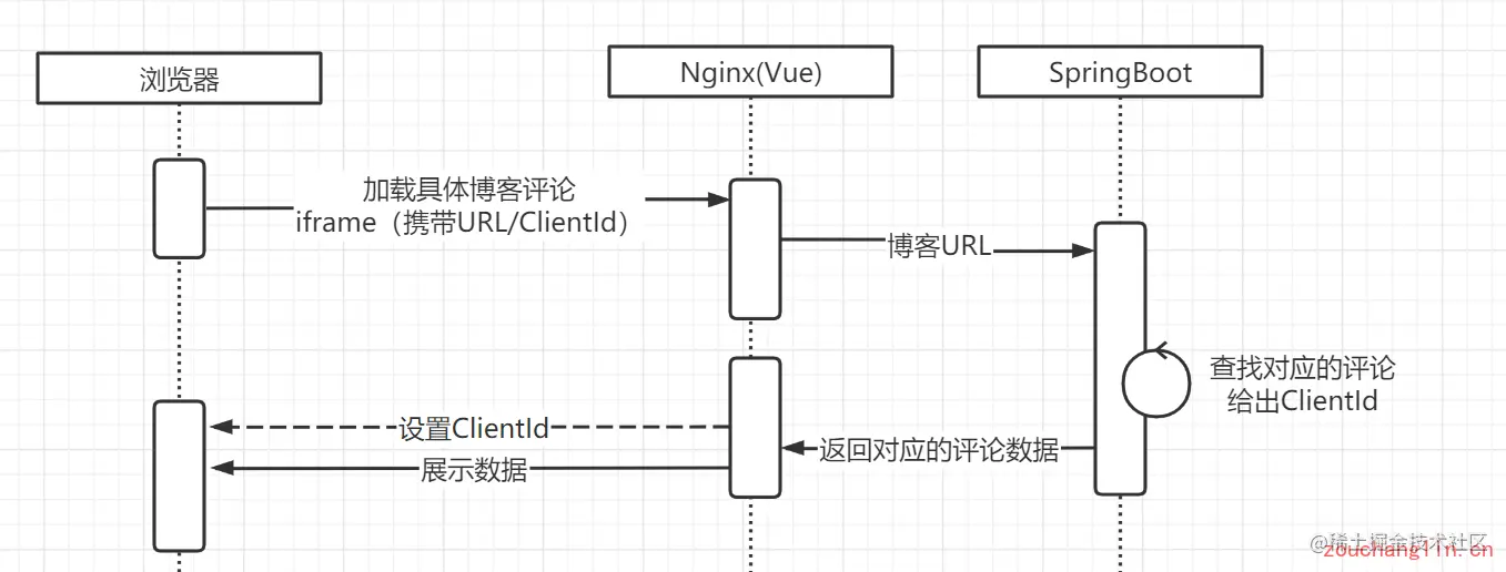 首先对于一个从未打开过某篇博客的页面的用户来说,在浏览器端存储的clientID肯定是没有这个字段的,直接可以判定为新用户,所以去请求后台给一个ClientID,并且分配随机的昵称和头像,把这个用户信息给落库,即使用户点击了刷新昵称和头像,但是ClientID并没有变,用户信息就这样得以保存了下来。如果浏览器已经存在了ClientID,那么数据库里面也应该有对应的用户信息,所以就直接请求后台拿到用户数据即可。