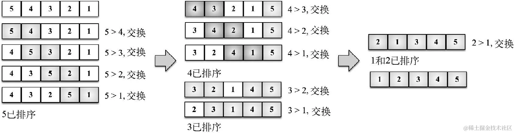 下面这个示意图展示了改进后的冒泡排序算法是如何执行的。