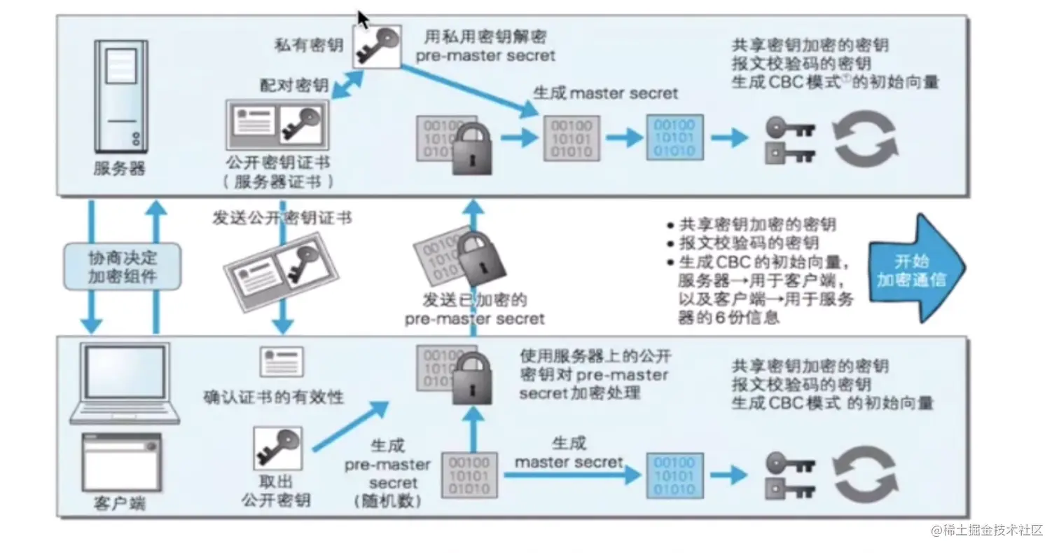 🌵HTTPS 采用共享密钥加密(对称)和公开密钥加密(非对称)两者并用的混合加密机制。若密钥能够实现安全交换,那么有可能会考虑仅使用公开密钥加密来通信。但是公开密钥加密与共享密钥加密相比,其处理速度要慢。