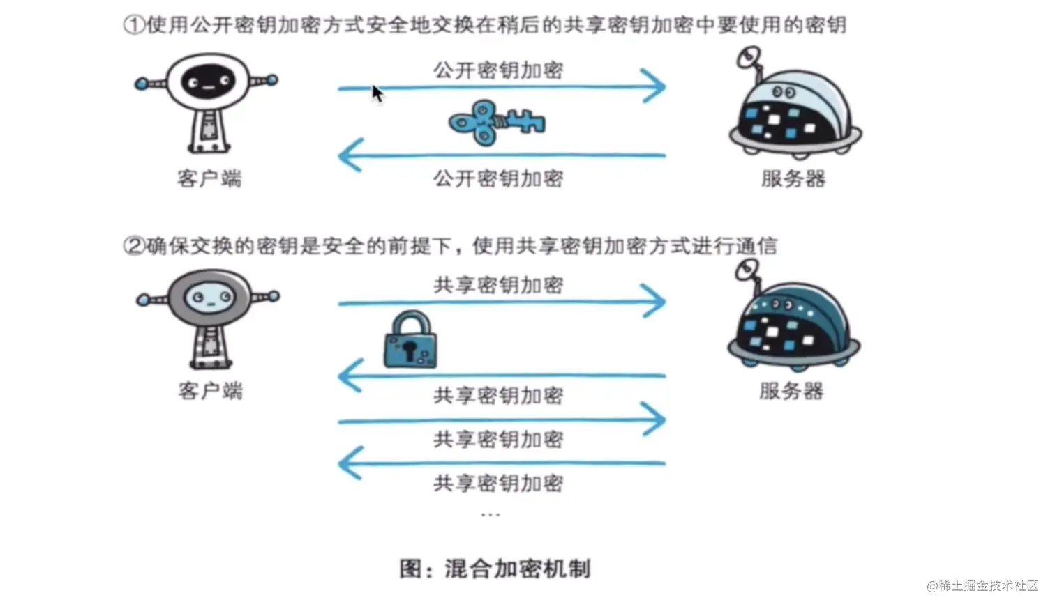 所以应充分利用两者各自的优势, 将多种方法组合起来用于通信。 在交换密钥阶段使用公开密钥加密方式,之后的建立通信交换报文阶段 则使用共享密钥加密方式。