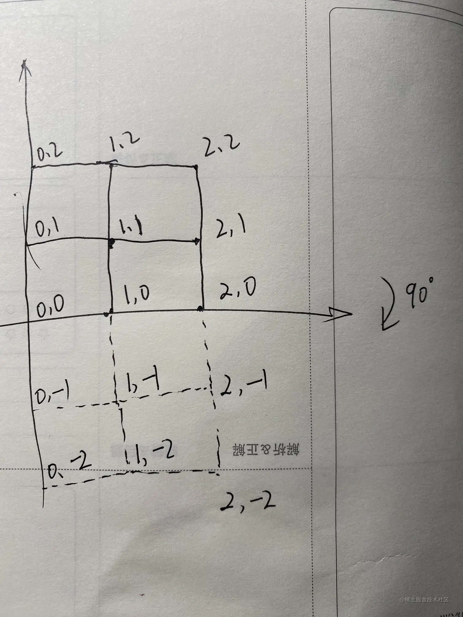 先作图,画一个3*3的图像,并标出坐标。实线为旋转前的,虚线为旋转90度后的图像,可根据简单的规则,点A(x,y)旋转90度后的坐标是A`(y, -x),图像旋转后,可以把实例[[1,2,4],...]套进去,这个时候,不需要关心矩阵中的数值是否有关联规则,可以是任意数,变换后其所代表的数值仍然保持不变。