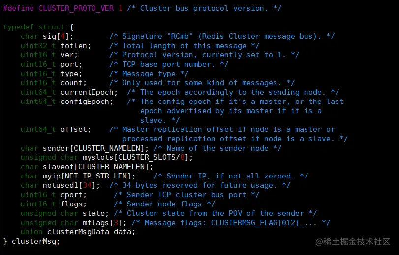 char sig[4]; /* Signature "RCmb" (Redis Cluster message bus). */