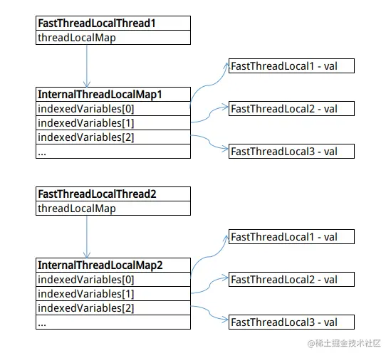 InternalThreadLocalMap#indexedVariables是一个数组,存放了当前线程所有FastThreadLocal对应的值。