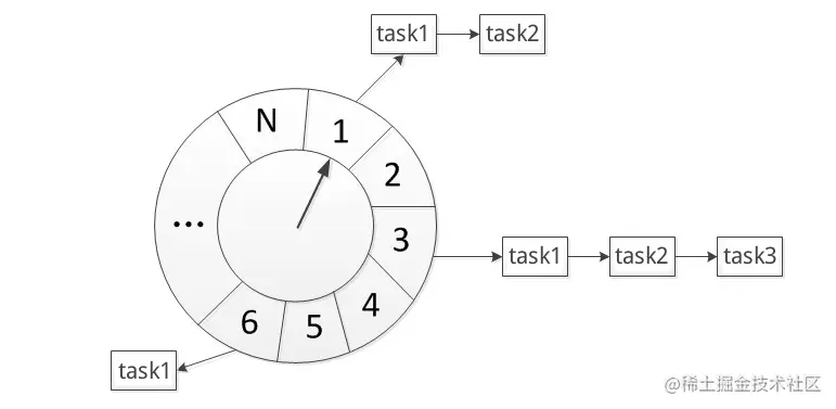简单说,就是将延时任务存放到一个环形队列中,并通过执行线程定时执行该队列的任务。