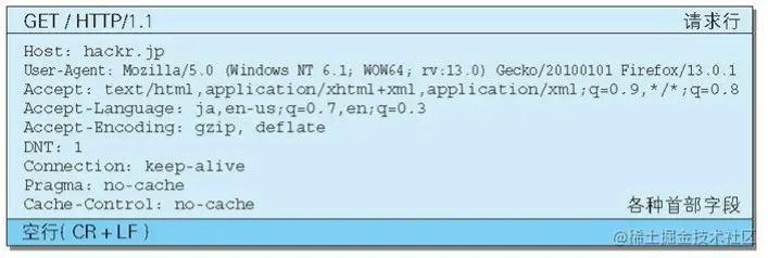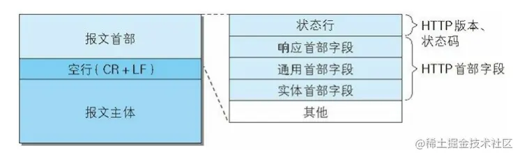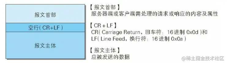 HTTP 报文大致可分为报文首部和报文主体两块。两者由最初出现的空行(CR+LF)来划分。通常,并不一定要有报文主体。