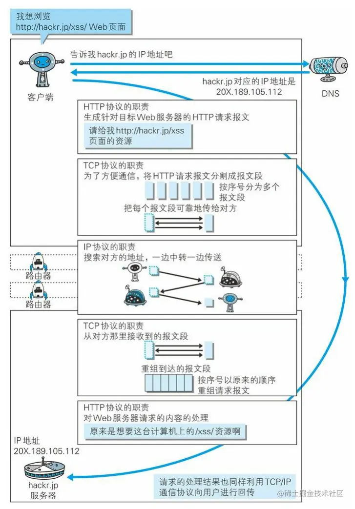 通过下面一张图,看各个协议在HTTP协议通信中发挥的哪些作用?假设想浏览hackr.jp/xss/Web页面