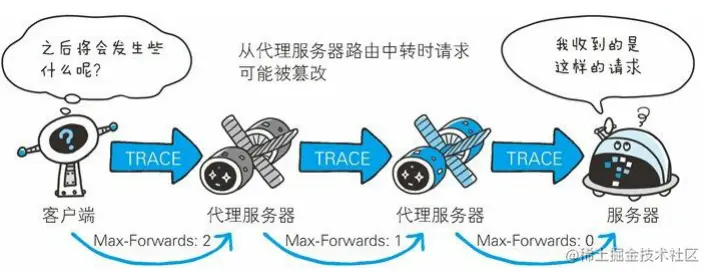 客户端通过TRACE方法可以查询发送出去的请求是怎样被加工修改的。这是因为请求想要连接到源目标服务器可能会通过代理中转,TRACE方法就是用来确认连接过程中的发生一系列的操作。