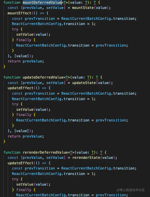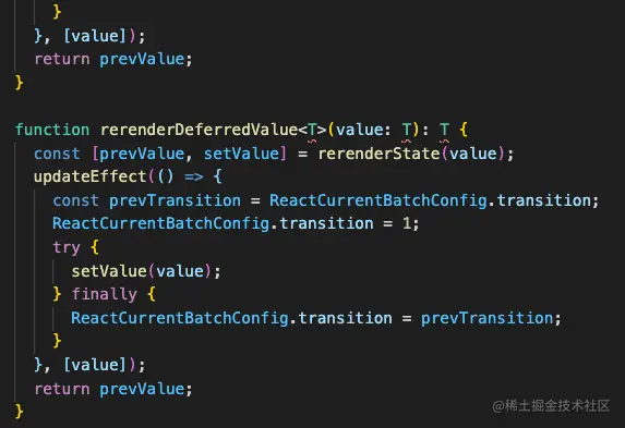 源代码明显可以和useTransition联系,使用useEffect监听value的变化,然后在useTransition中的startTransition方法中更新value。从而实现延迟更新的效果。