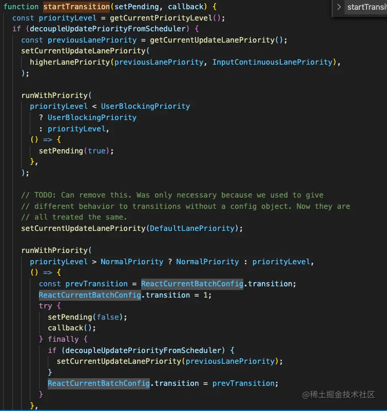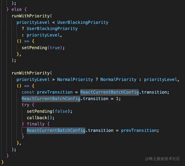 在加载时将当前dom实例保存并存储状态,在开启过渡startTransition函数中,拉取当前优先执行队列级,通过不断比对优先级runWithPriority()函数,只有在队列优先等级大于UserBlockingPriority(98)则必然会大于NormalPriority(97),runWithPriority接收普通执行队列时才会判定不用再继续维持pending状态,返回页面状态。