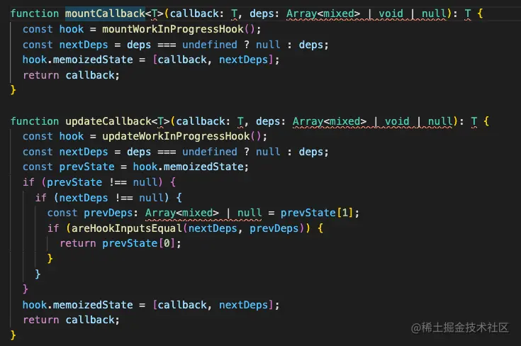 useCallback组件加载时将回调加载上,在更新视图/重新渲染时更新回调。两者的公共代码部分都为将钩子的存储状态更新,根据return出来的回调更新视图。不同点在于在更新callback时会取之前钩子存储状态和现有分片调用时的参数进行比对。如相同则现有的callback就无意义,返回之前的状态