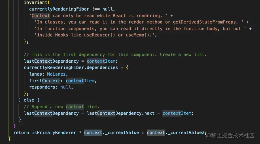 无论是mount还是update都是调用readContext方法。从最后return的结果来看,它都是返回当前ReactContext的值。所以在调用这个方法时只能查看上下文容器, 如果有小伙伴对于ReactContext不懂的可以查看React Context(上下文) 作用和使用 看完不懂 你打我