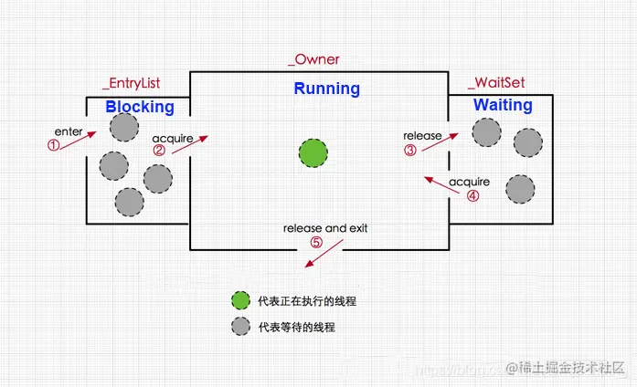 我们来对上图进行分析,当有多个线程需要对某个资源进行锁定时,需要先通过①进入EntryList,在EntryList中的线程通过②acquire操作获取该monitor,一旦获取成功,其他线程需要在EntryList中阻塞等待,获取成功的线程可以对对象进行修改,此时如果有当前线程调用wait方法,则会暂时让出执行权,通过③进入waitSet中等待重新获取执行权,一旦获取成功则重新进入并继续执行,当操作结束后通过⑤交出执行权并离开monitor,其他线程再进行争抢Monitor