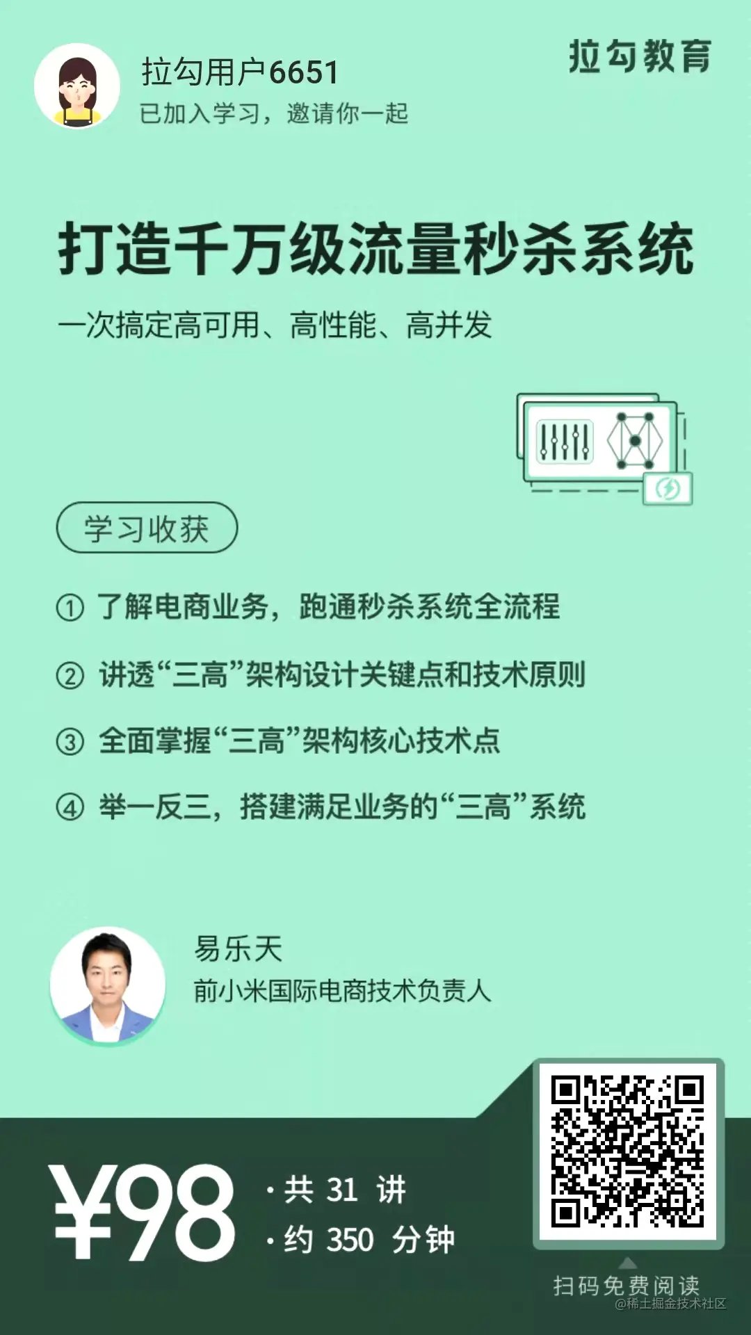 在这里我给大家推荐拉勾教育上的专栏《打造千万级流量秒杀系统》。在这门专栏里,我们会为你呈现一个完整的秒杀项目流程,从需求分析、架构设计、代码实现、性能测试这四大部分,渐次带你设计出符合“三高”要求的秒杀系统,真正搞懂“三高”架构及其实现,并举一反三,轻松搭建其他满足业务需求的“三高”架构。