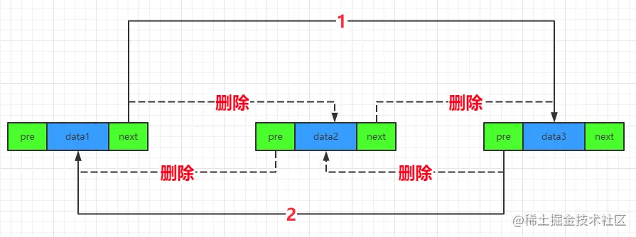 针对第二种情况,已知了要被删除节点x的位置;由于单链表没有存储x的前驱节点位置,所以需要遍历查找x的前驱节点,时间复杂度为O(n);而双向链表存储了前驱节点的位置,所以查找时间复杂度为O(1),总时间复杂度为O(1),由此可以看出来双向链表的优势了。