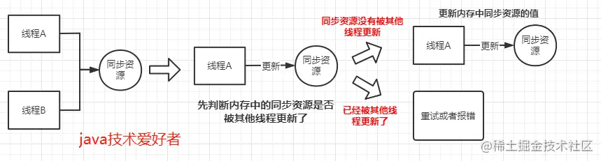乐观锁,顾名思义它总是假设最好的情况,线程每次去拿数据时都认为别人不会修改,所以不会上锁,但是在更新的时候会判断一下在此期间别人有没有去更新这个数据,如果这个数据没有被更新,当前线程将自己修改的数据成功写入。如果数据已经被其他线程更新,则根据不同的实现方式执行不同的操作(例如报错或者自动重试)。如图所示: