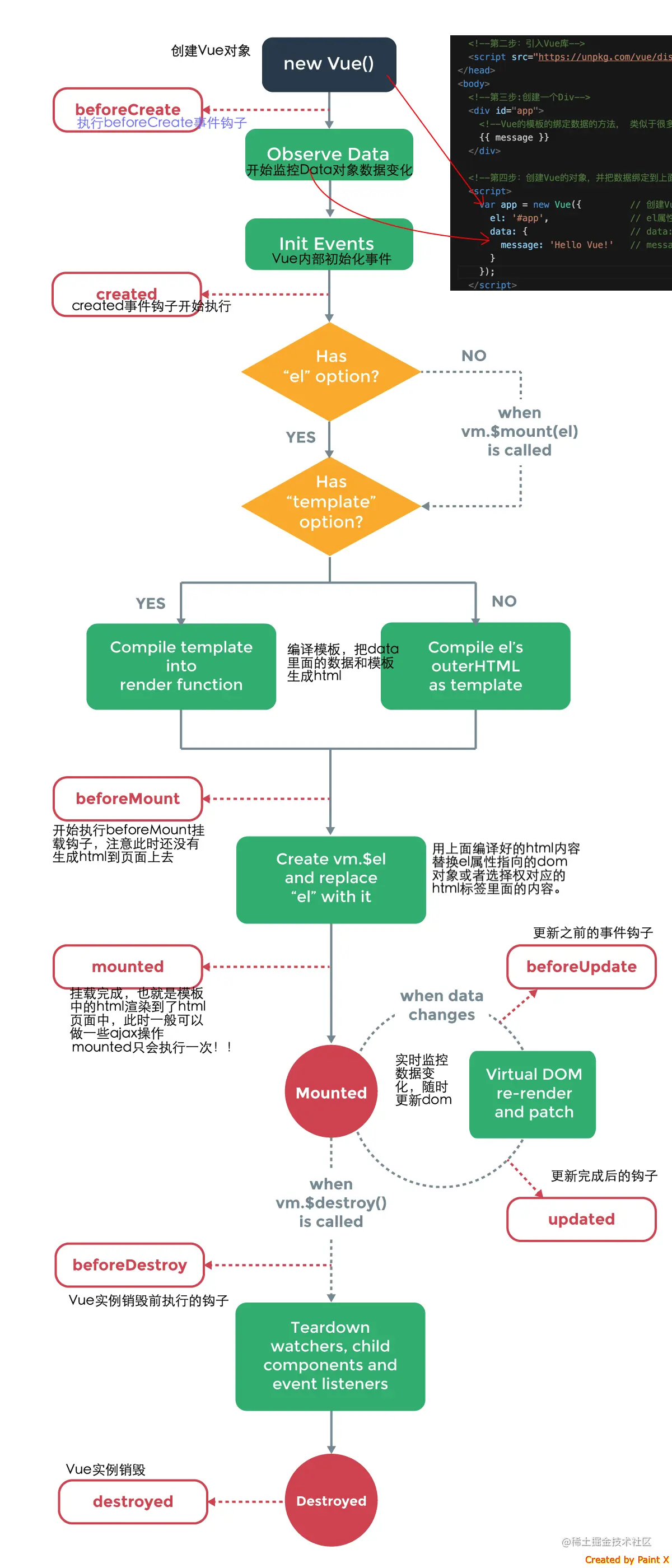 - mounted:在模板渲染成html后调用,通常是初始化页面完成后,再对html的dom节点进行一些需要的操作