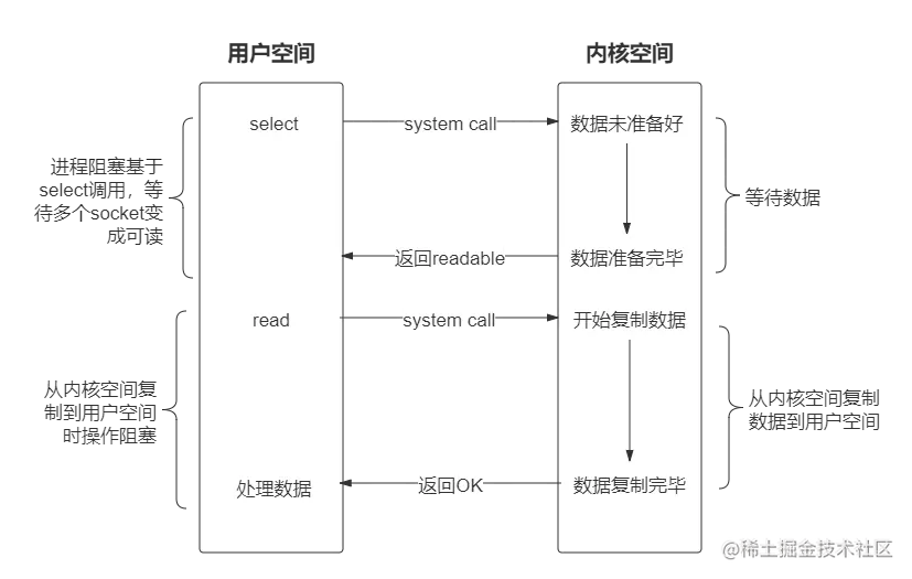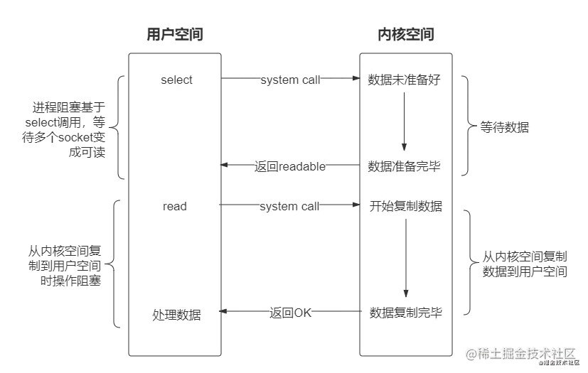 多路复用有很多实现,以select为例,当用户进程调用了多路复用器,进程会阻塞。内核会监视多路复用器所负责的所有socket,当任务一个socket数据准备好了,多路复用器就会返回。这时候用户进程在调用read操作,把数据从内核缓冲区拷贝到用户缓冲中。