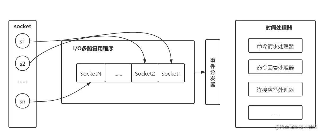 客户端操作的时候会产生不同事件的socket。在服务端I/O多路复用程序会把消息放入消息队列中,然后通过事件分发器,转发到不同的事件处理器中