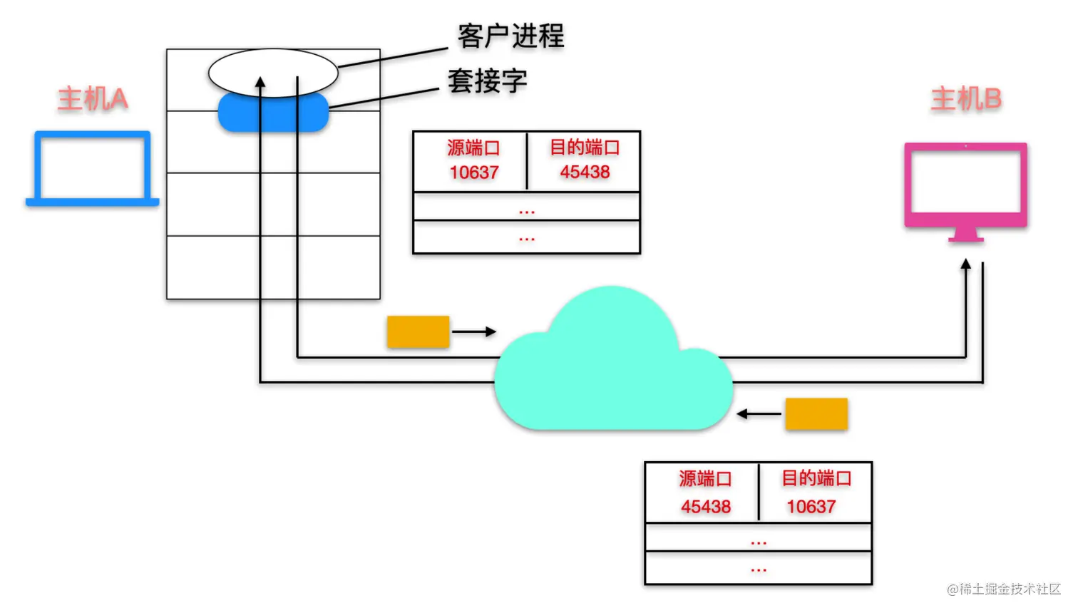 开发人员会编写代码确定端口号是周知端口号还是时序分配的端口号。假如主机 A 中的一个 10637 端口要向主机 B 中的 45438 端口发送数据,运输层采用的是 UDP 协议,数据在应用层产生后,会在运输层中加工处理,然后在网络层将数据封装得到 IP 数据报,IP 数据包通过链路层尽力而为的交付给主机 B,然后主机 B 会检查报文段中的端口号判断是哪个套接字的,这一系列的过程如下所示