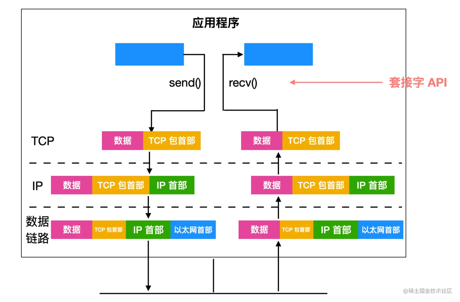 虽然套接字 API 位于应用程序层和传输层之间的通信模型中,但是套接字 API 不属于通信模型。套接字 API 允许应用程序与传输层和网络层进行交互。