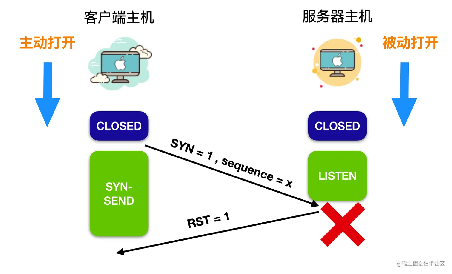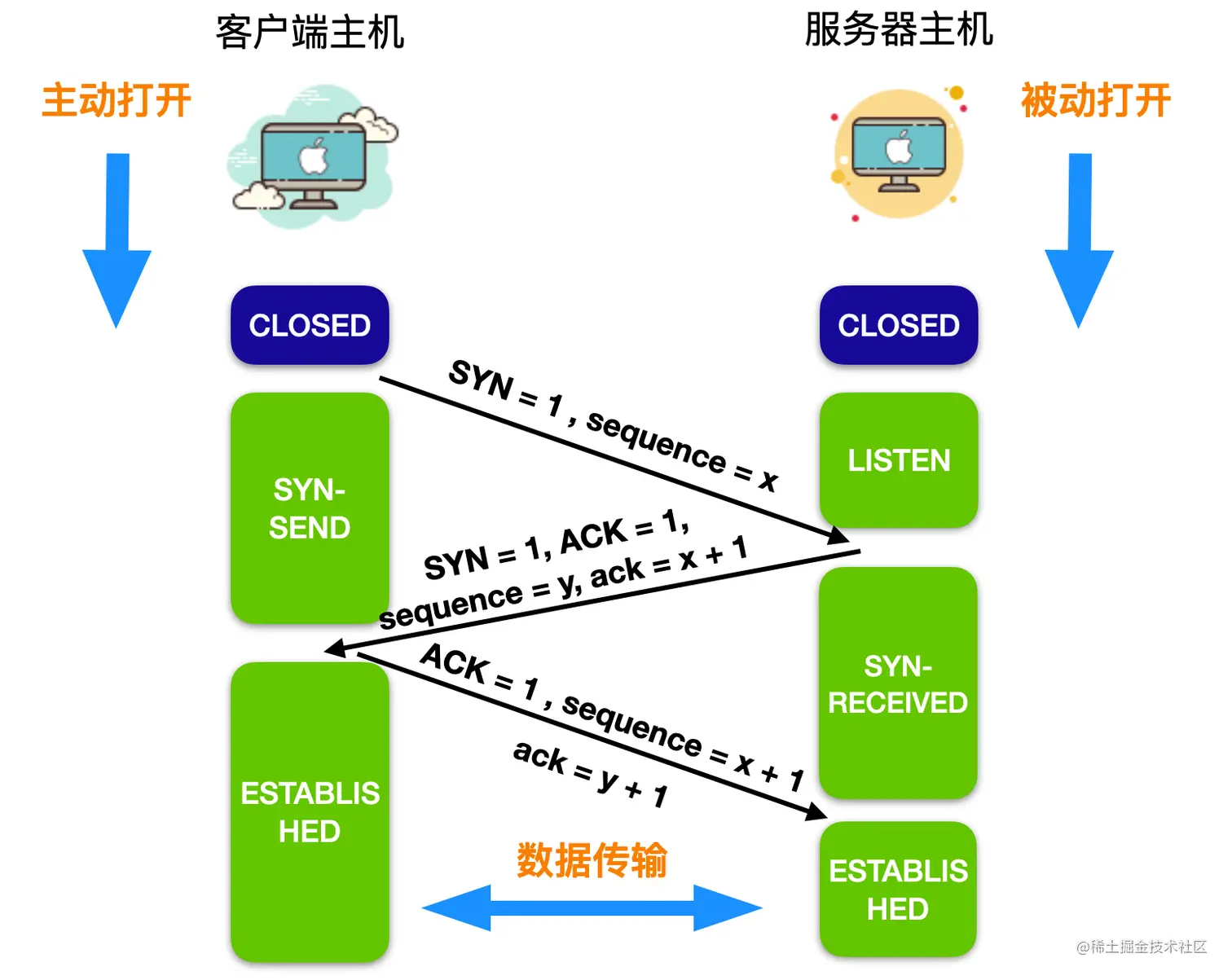 下图画出了 TCP 连接建立的过程。假设图中左端是客户端主机,右端是服务端主机,一开始,两端都处于CLOSED(关闭)状态。