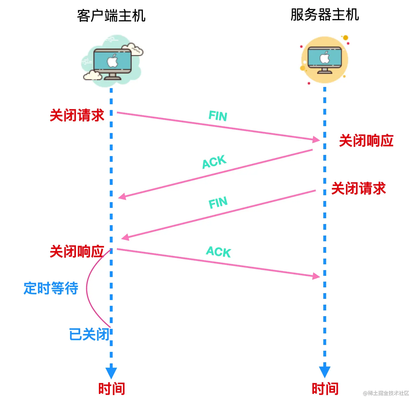 这里注意一点:在服务器发送了 FIN-ACK 之后,会立即启动超时重传计时器。客户端在发送最后一个 ACK 之后会立即启动时间等待计时器。