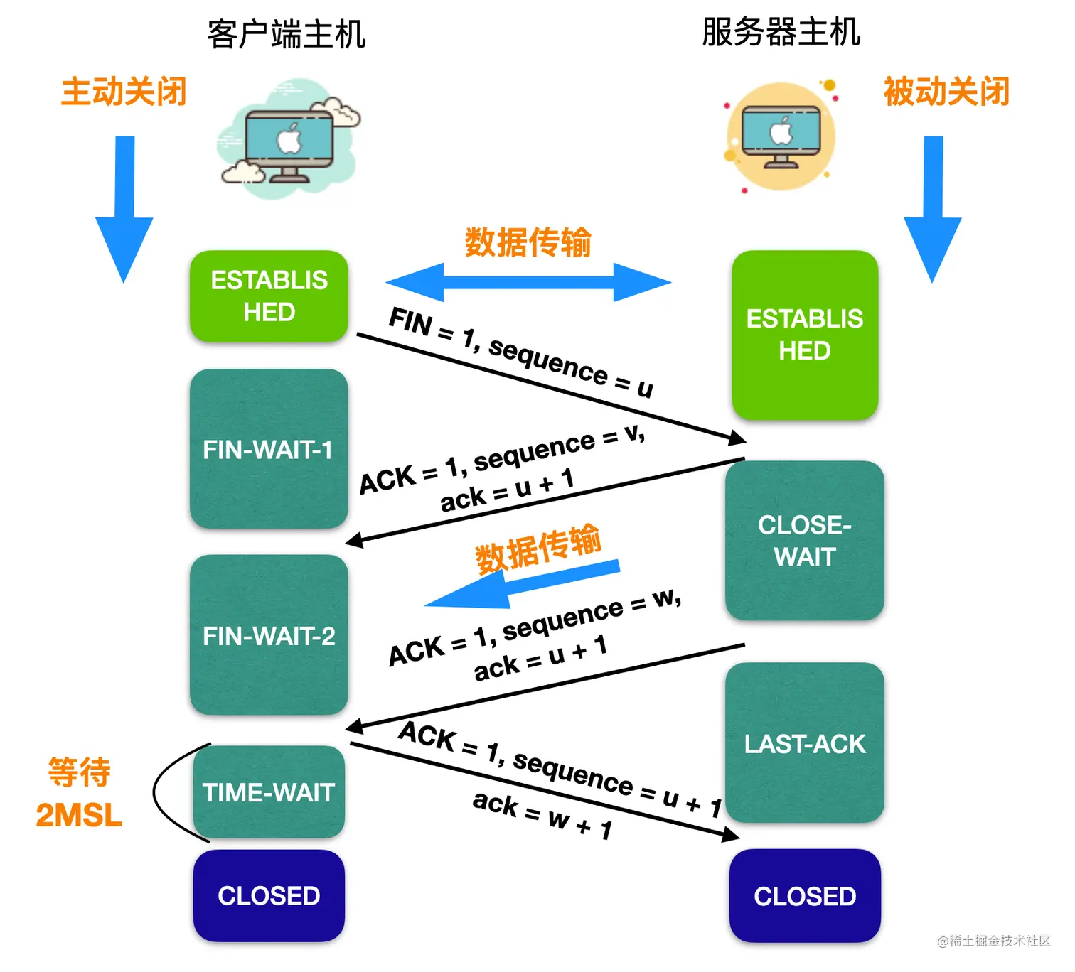 数据传输结束后,通信的双方可以释放连接。数据传输结束后的客户端主机和服务端主机都处于 ESTABLISHED 状态,然后进入释放连接的过程。