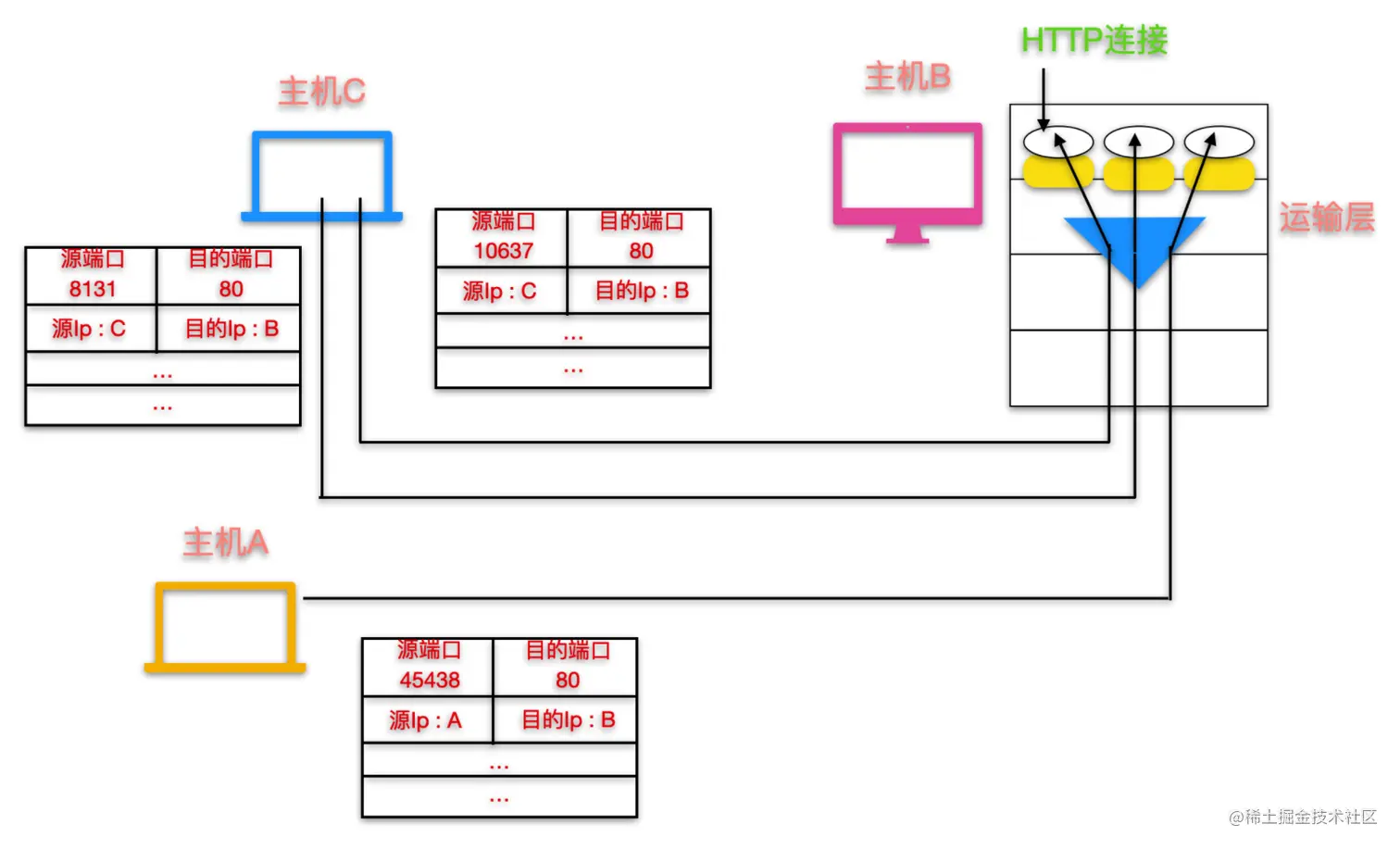 上图显示了面向连接的多路复用和多路分解的过程,图中主机 C 向主机 B 发起了两个 HTTP 请求,主机 A 向主机 C 发起了一个 HTTP 请求,主机 A、B、C 都有自己唯一的 IP 地址,当主机 C 发出 HTTP 请求后,主机 B 能够分解这两个 HTTP 连接,因为主机 C 发出请求的两个源端口号不同,所以对于主机 B 来说,这是两条请求,主机 B 能够进行分解。对于主机 A 和主机 C 来说,这两个主机有不同的 IP 地址,所以对于主机 B 来说,也能够进行分解。