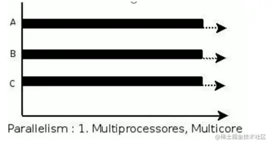 - 当系统有一个以上 CPU 时,当一个 CPU 执行一个进程时,另一个CPU可以执行另一个进程,两个进程互不抢占CPU资源,可以同时进行,我们称之为并行(Parallel)。