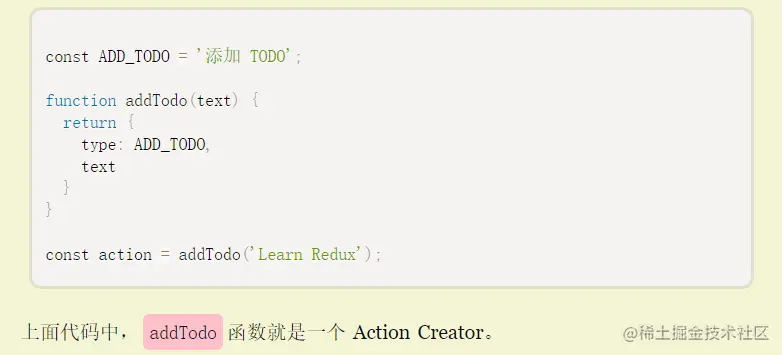 view要发送多少种消息,就会有多少种Action,如果都手写,会很麻烦,可以定义一个函数用来生成action,这个函数就叫Action Creator