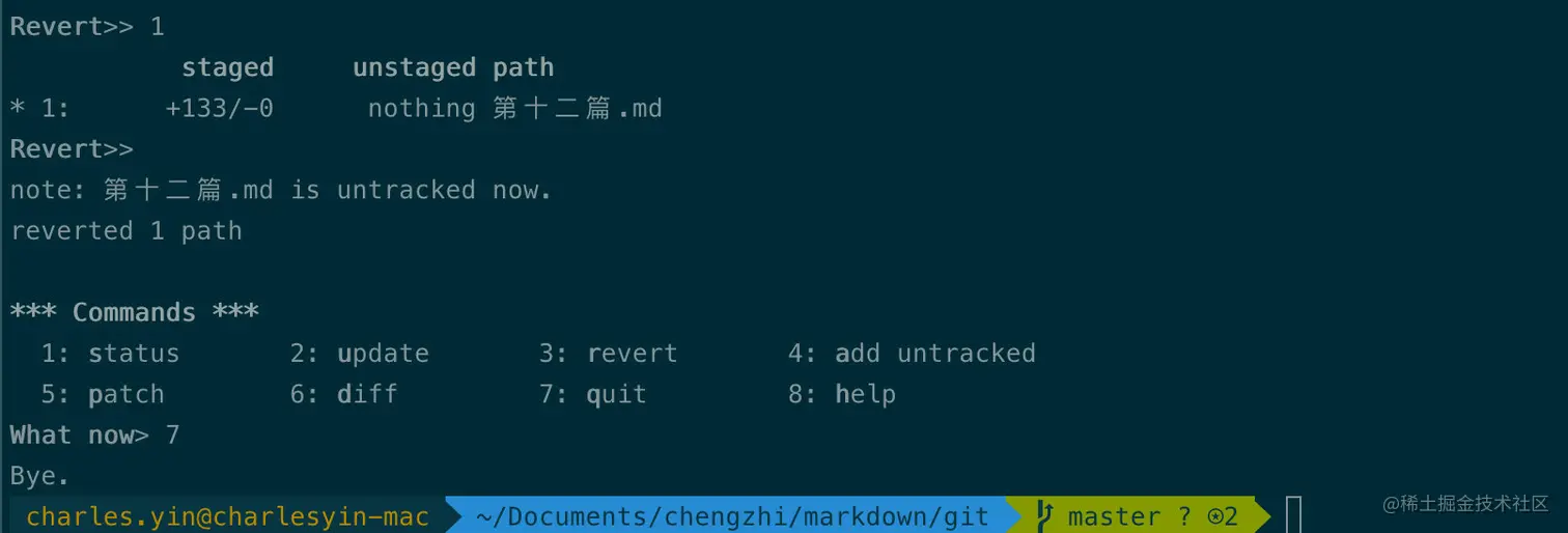 交互式暂存的命令非常简单,其实就是一个参数,-i。这里的i表示的是interactive,也就是交互的意思。当我们执行这个命令之后,git会进入一个交互式的终端。这样我们就可以通过一些简短地命令和git进行交互。