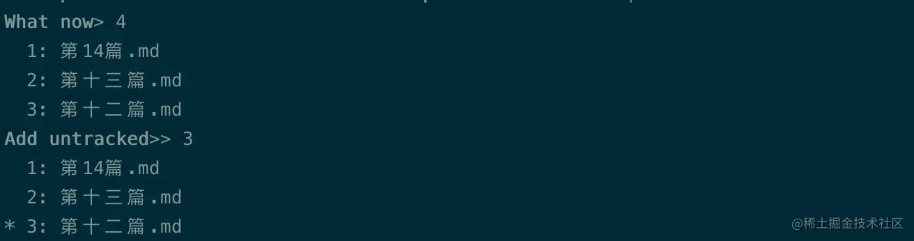首先是将新文件添加到暂存区,我们选择4,表示添加未被git管理的文件,接着又会询问我们要添加的文件。这里我们就不用再输入文件名了,直接选择序号即可。我们先添加一个,选择3。之后我们会看到3对应的文件名前面被打上了*,表示这个文件将会被添加。