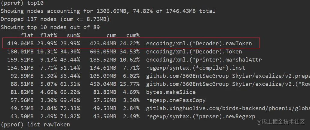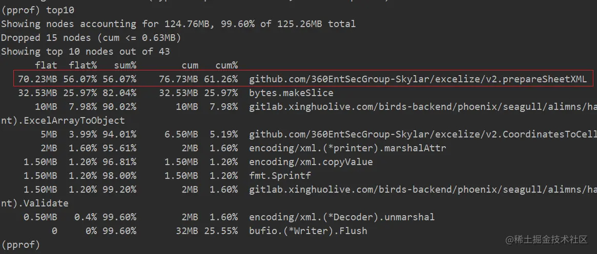 rows, err := fillExcelFile.GetRows(sheetName)这行代码导致内存突然增加,GetRows是第三方包的一个函数func GetExcelRows(infra *middleware.Infra, ossFileData []byte) ([][]string, error) { ... fillExcelFile, err := excelize.OpenReader(reader) ... rows, err := fillExcelFile.GetRows(sheetName) ... return rows, nil } -