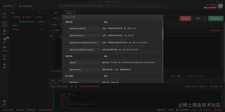 然后在json中引用mock,引用格式"变量名":"mock变量名",直接复制内置mock变量名字就可以了。